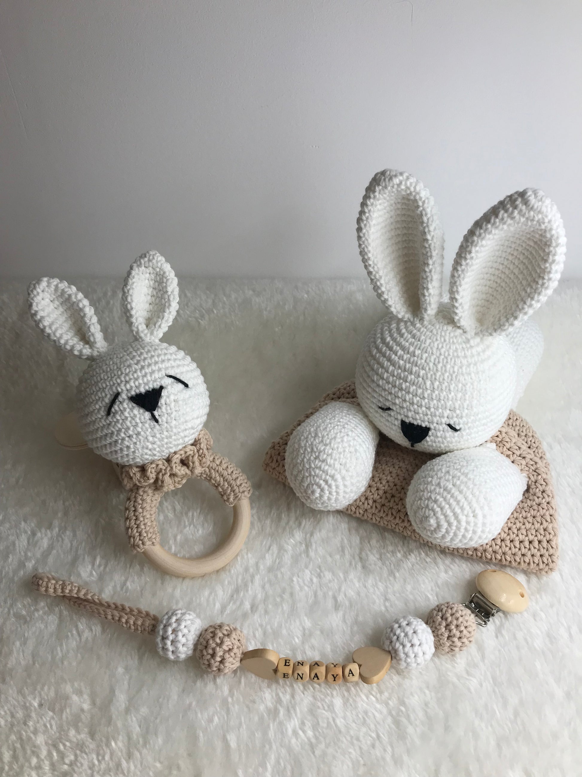 Coffret doudou sleepy, hochet et attache-tétines personnalisable - Fait à la main au crochet - Made in France
