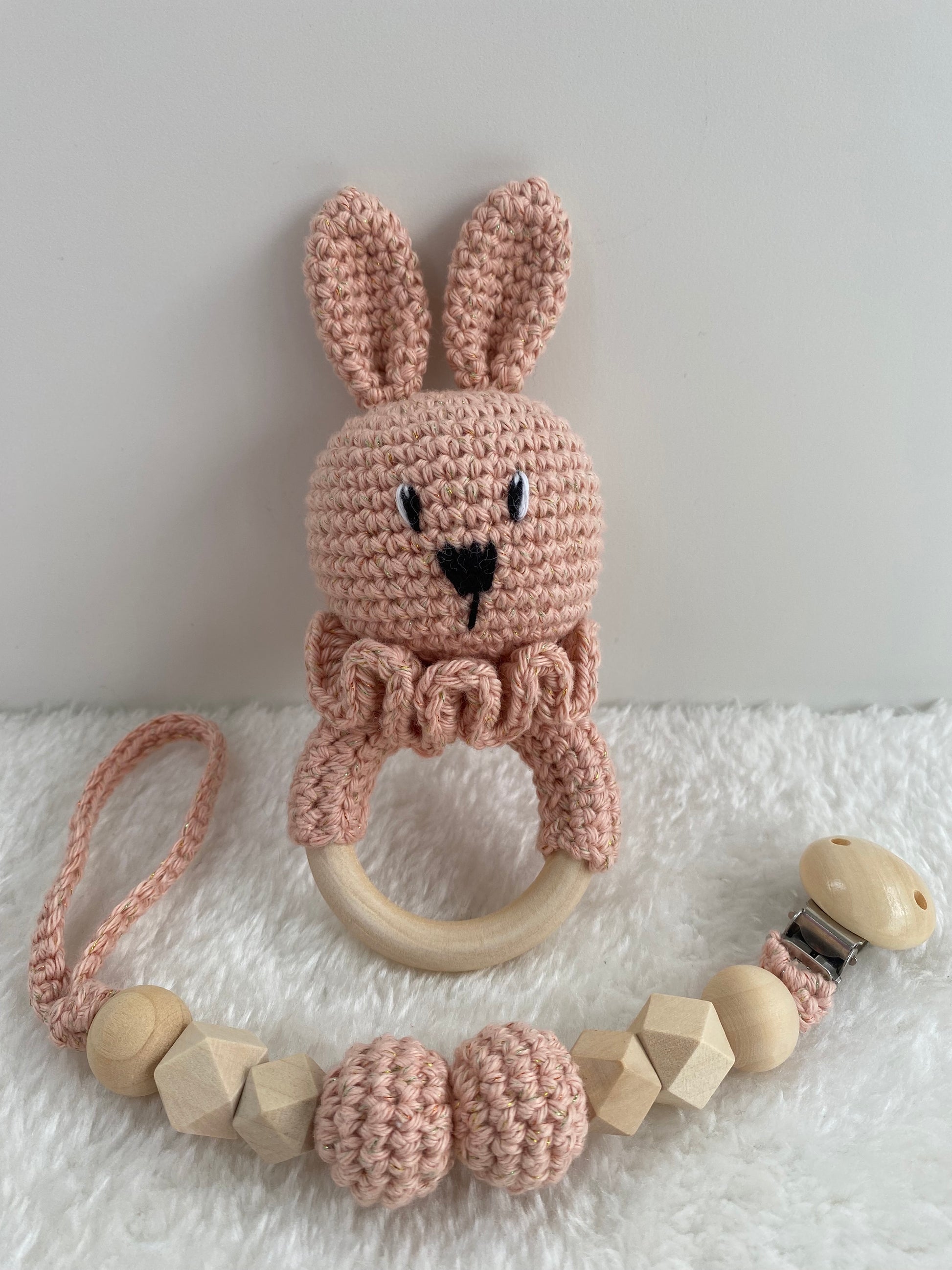 Coffret cuty lapin et son attache-tétines - Fait à la main au crochet - Made in France